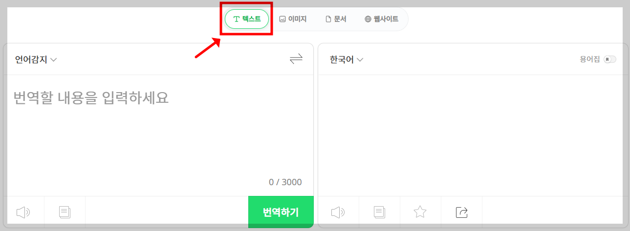 - 왼쪽에 번역할 언어, 오른쪽에 결과 언어 선택