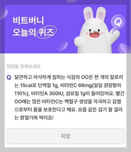 "달큰하고 아삭하게 씹히는 식감의 OO은 한 개의 칼로리는 15cal로 단백질 1g,