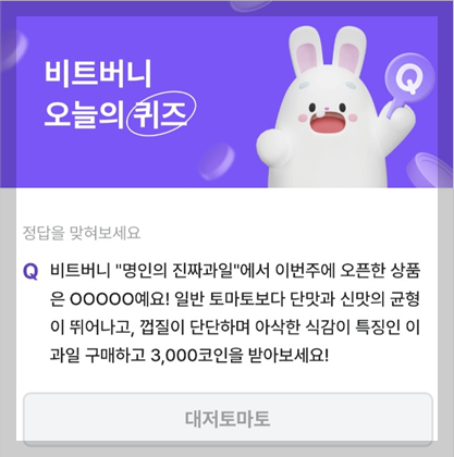 "비트버니 '명인의 진짜과일'에서 이번주에 오픈한 상품은 OOOOO예요!