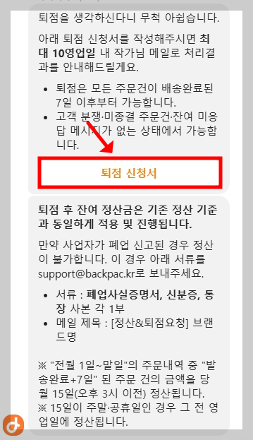 - 퇴점 신청 후 영업일 기준 최대 10일 이내 등록된 메일로 처리 결과가 안내됩니다.