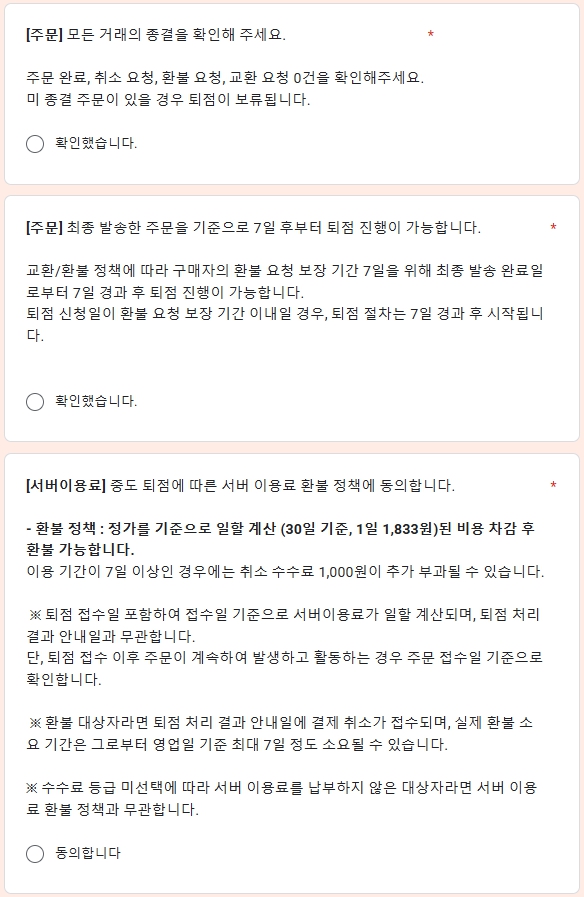 ▶ 구글폼 신청서 세번째 페이지입니다. (퇴점 신청 전 알아두어야 할 중요 내용을 확인합니다.)