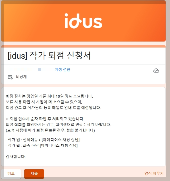 A. 아이디어스 퇴점은 작가웹 채팅상담을 통해 먼저 문의한 뒤, 제공받은 구글폼 링크를 통해 신청서 작성으로 진행됩니다.