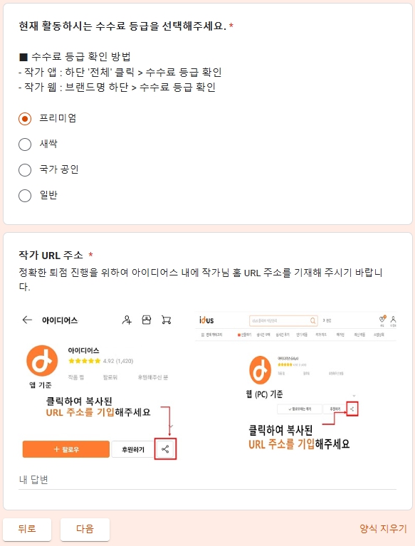 ▶ 구글폼 신청서 첫번째 페이지입니다. (브랜드명 / 메일주소 / 수수료 등급 / 작가 URL 주소를 입력합니다.)