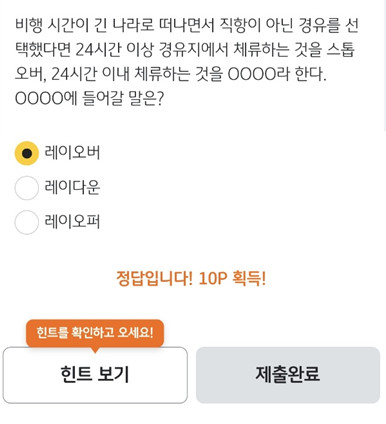 체류하는 것을 스톱오버, 24시간 이내 체류하는 것을 OOOO라 한다. OOOO에 들어갈 말은?"